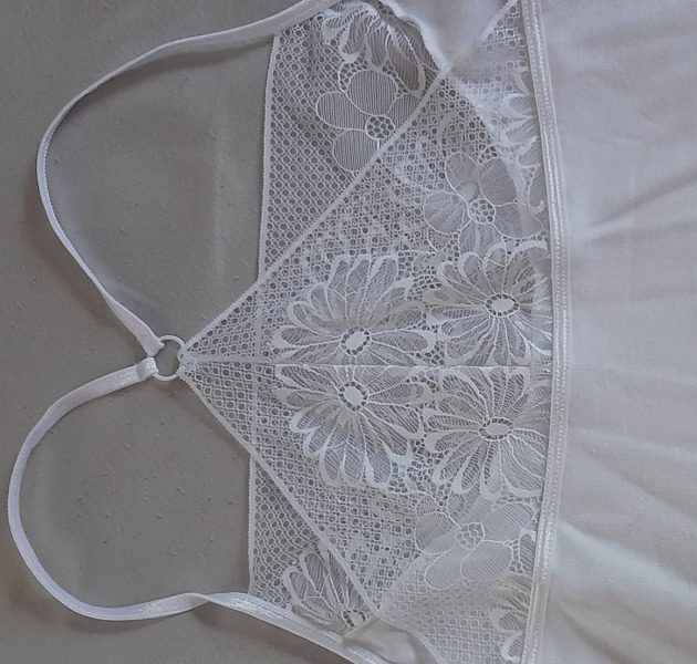 • Koszulka na cienkich, skrzyżowanych na plecach ramiączkach. Wstawka z kwiecistej koronki na dekolcie i plecach. Dostępna w dwóch kolorach. Zaprojektowana i uszyta w Polsce.
